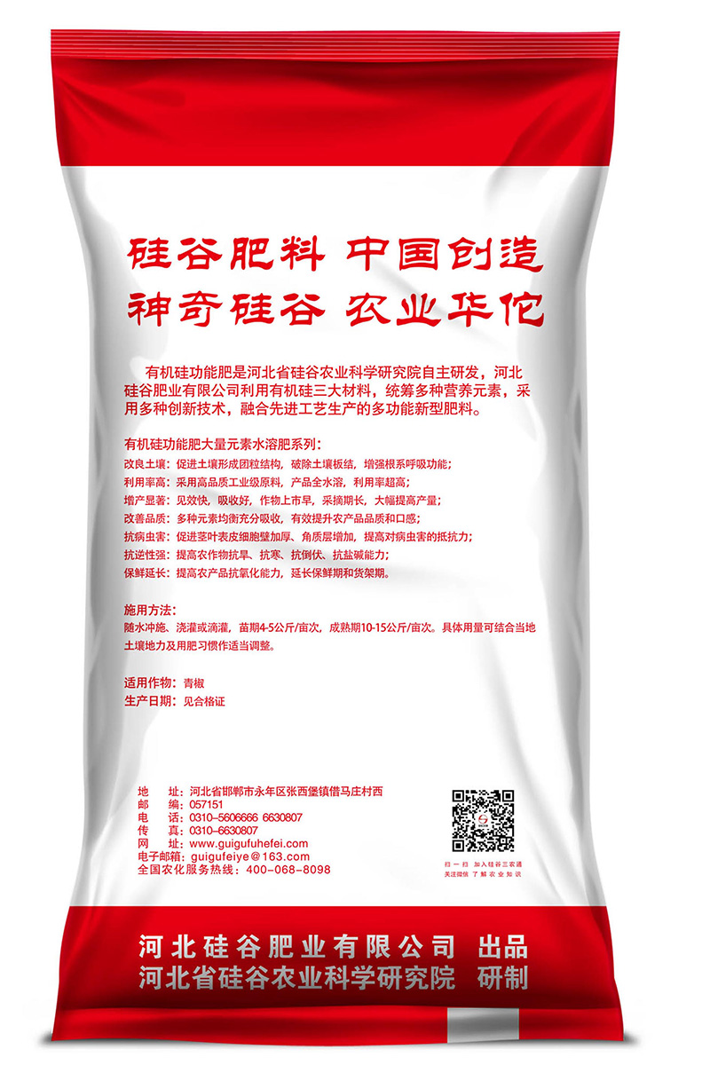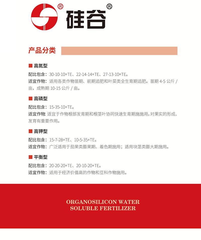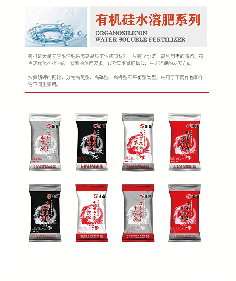 The organosilicon large element water-soluble fertilizer is made of high-quality industrial raw materials, with the characteristics of full water-soluble and high utilization rate, which meets the use requirements of modern agricultural irrigation and drip irrigation, as well as the development direction of national weight loss and efficiency, ecological and environmental protection.
