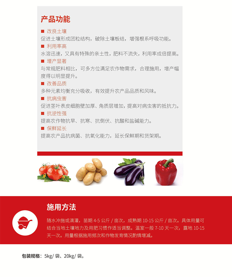Suitable crops: it is widely used in eggplant fruit expanding stage and coloring stage; It is suitable for tuber expansion stage.