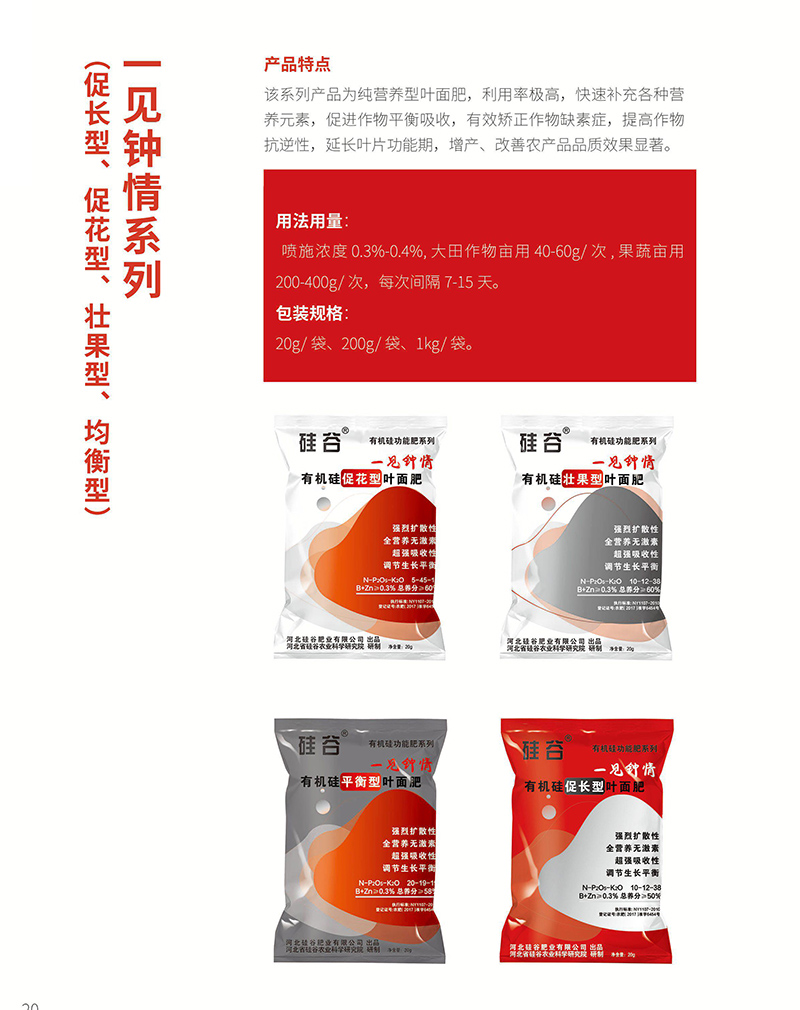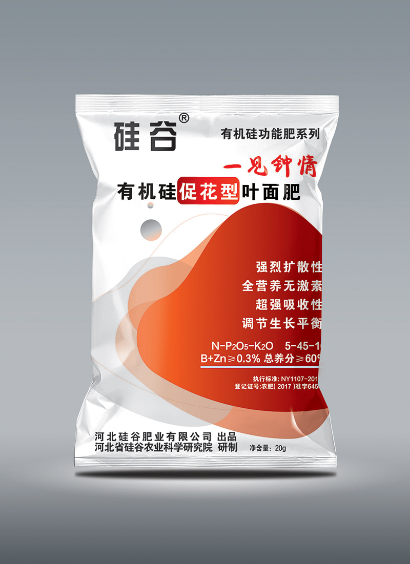 Organosilicon foliar fertilizer is divided into organosilicon potassium dihydrogen phosphate and love at first sight series (growth promoting type, flower promoting type, fruit strengthening type and balanced type).